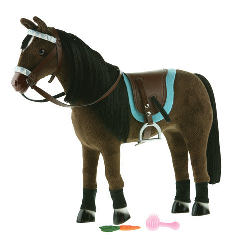 This extra lovable, finely-detailed horse has articulated legs, poseable ears and a mouth that can be opened. Accessories include a bridle, saddle, saddle pad, 4 leg wraps, carrot, brush, certificate of authenticity and a special key code for use on www.ParadiseHorseClub.com. The horse stands approx. 10 1/2 inches tall and is a perfect companion for any 10 to 12-inch doll.