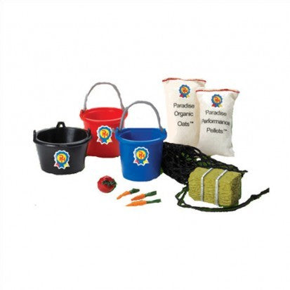 The Paradise Horses™ Feed Set comes with all the elements necessary to feed and care for your horse or pony. The complete set includes a feed bucket, flat-sided water bucket, hay with a hay net, carrots, apple, feed tub, and bags of both Paradise Performance Pellets™ and Paradise Organic Oats™.