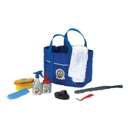 Tote bag, dandy brush, curry comb, hoof pick, comb, hoof oil can, mud/sweat scraper, towel and spray bottle. WARNING: CHOKING HAZARD - Small parts. Not for children under 3 yrs.