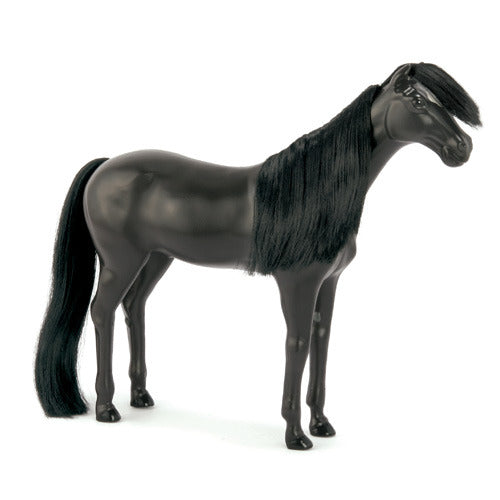 Fully posable horse that is jointed to simulate real movement. Highly detailed and life-like features, such as expressive and bright eyes, brushable manes and tails, resilient bodies and mouths that open to accept a bit or carrot. Black body color with black colored mane and tail. Comes with a halter, comb and carrot. WARNING: CHOKING HAZARD - Small parts. Not for children under 3 yrs.
