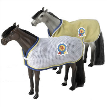 Our white woven cotton anti-sweat sheet features blue trim and yellow piping. The lightweight, closely-woven fabric is extremely absorbent and very durable. Like the anti-sweat sheet, our heavyweight yellow stable blanket with blue and white trim also features the Paradise Horses™ embroidered monogram for easy identification. Both the stable blanket and anti-sweat sheet fasten with velcro. WARNING: CHOKING HAZARD - Small parts. Not for children under 3 yrs.