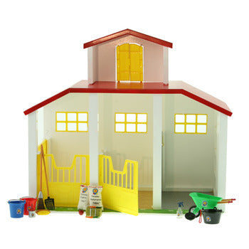 The heart of any farm, our Stable Play Set is the perfect place to explore life on the farm! The stable features an open design - perfect for play! The Stable Play Set includes: a wooden stable, feed bucket, water bucket, feed tub, hay bale, 3 carrots, apple, 2 feed bags, spray bottle, dandy brush, curry brush, pitchfork, wheelbarrow, broom, hoof pick, hoof oil can, and stickers to decorate the stable. Fits most horses up to 1:7 scale (horse dimensions up to 7.25 L x 10.25 H).